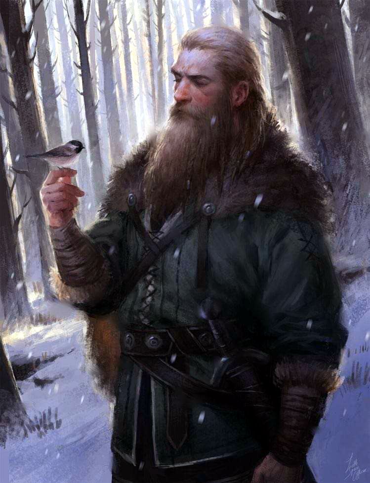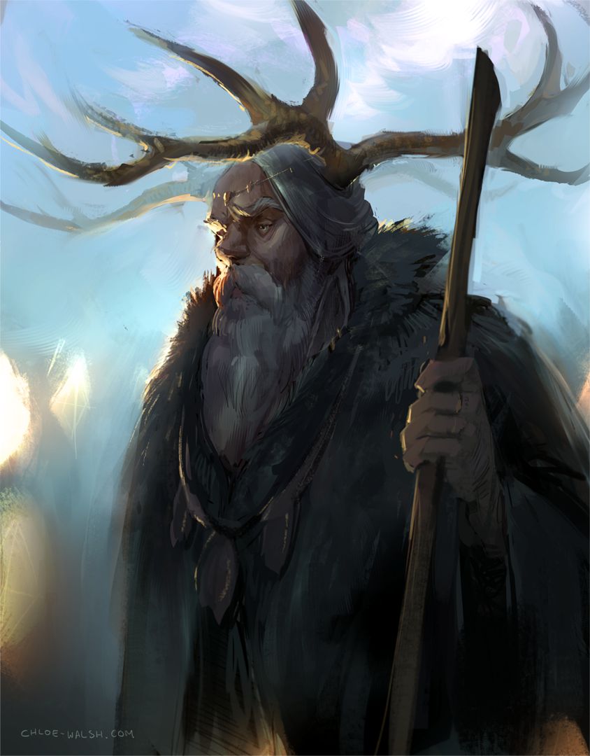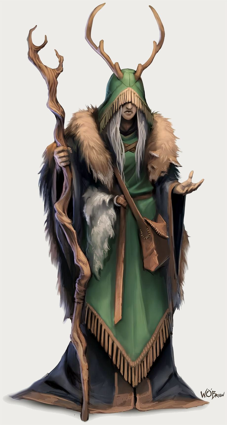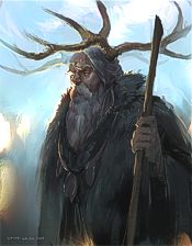 Yuri est une figure légendaire des terres froides et inhospitalières du Nord Glacial, à la fois respecté et craint, à la fois noble et sauvage, dont le nom résonne comme un murmure dans les forêts profondes. Son visage marqué par l’âge, sa grande barbe grise et son regard sévère témoignent de son expérience et de la gravité de ses responsabilités. Son caractère sombre, les impressionnants bois de cerf qui ornent sa tête et la cape de fourrure noire qu’il porte en permanence lui ont valu son nom druidique.