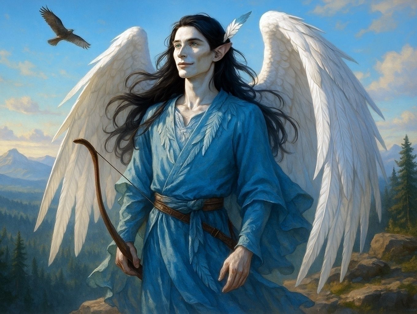 Profondément religieux, il voue une immense vénération à Aerdrie Faenya, déesse elfique des Cieux et Reine des avariels, mais il n’en est pas moins totalement respectueux de la Vieille Foi et accorde sa croyance aux principes druidiques. Il a accès à tous les sorts spéciaux du clergé d’Aerdrie Faenya mais ne peux pas utiliser de sorts des sphères élémentaires de Terre et de Feu. Il a une affinité particulière avec tous les oiseaux et la plupart des créatures aviennes, notamment les griffons. Lui-même ne peut adopter que la forme d’un oiseau (normal ou géant, jusqu’à 4 fois par jour) ou d’un griffon au plumage blanc (une seule fois par jour). Son compagnon animal est un grand faucon qui va et vient à sa guise, en totale liberté.